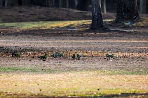 別府公園には周囲をぐるっと取り囲んだ照葉樹林帯がある。 この中に入られたら、暗いし茂みで見えないので鳥見はお手上げだ。 でもこれがあるからゆっくりのんびり休息できるのだろう。 芝地の中に樫や針葉樹の大木があって、アオバトの群れがここに入って…