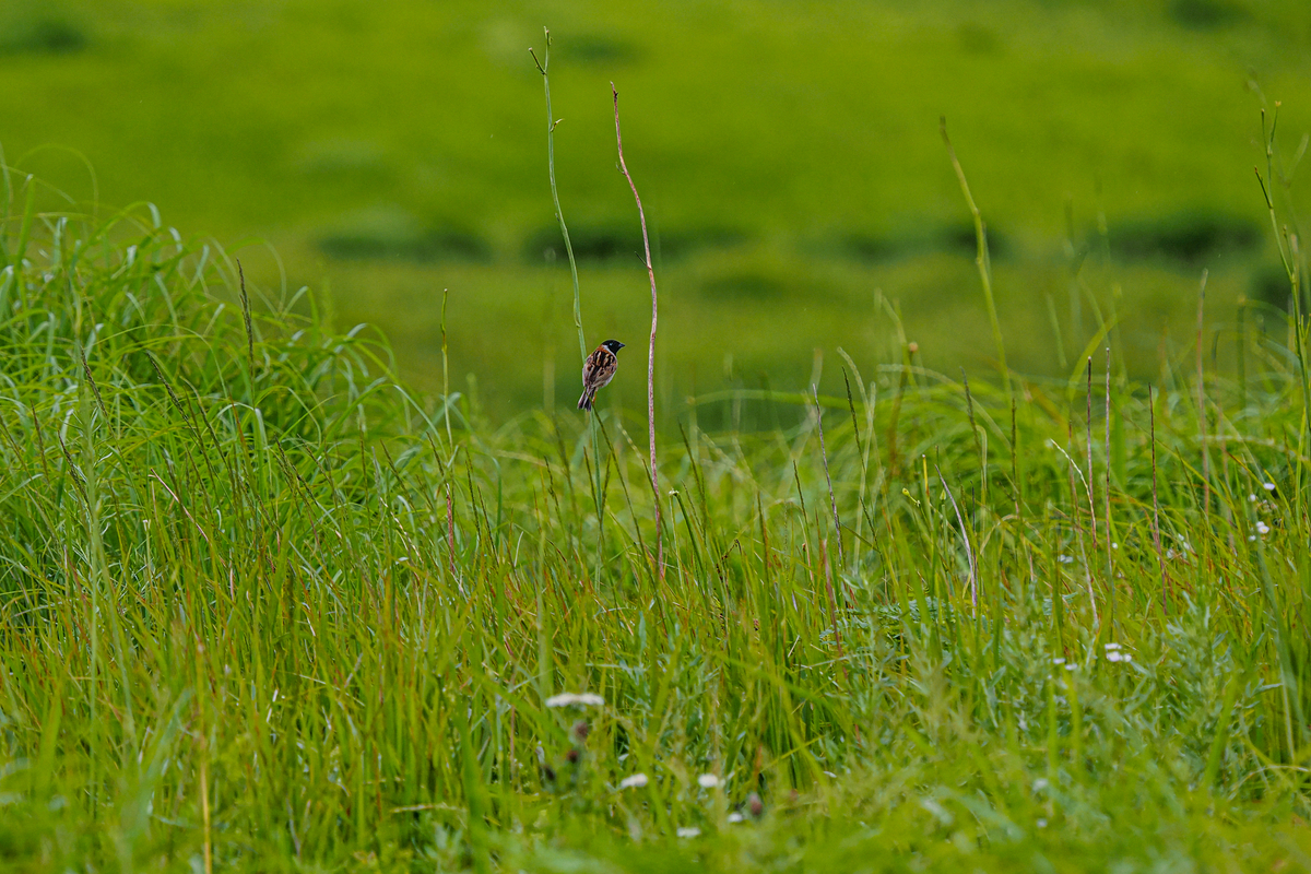 2023-08-01 嗚呼ユウスゲの丘 いきあたりばっ鳥 いつからかユウスゲの花に止まって囀る夏羽のコジュリンは、去りゆく夏の高原の定番になった。 コジュリンの生息地は九州では限られている。 ユウスゲの繁殖地もこの牧草地が一番見事だ。 ユウスゲとコジュリンのコラボはここをおいては他にない。 嗚呼しかし、今年の花はみんな鹿に食い荒らされてしまった。 せっかくの隠し球もこれでパーだ。