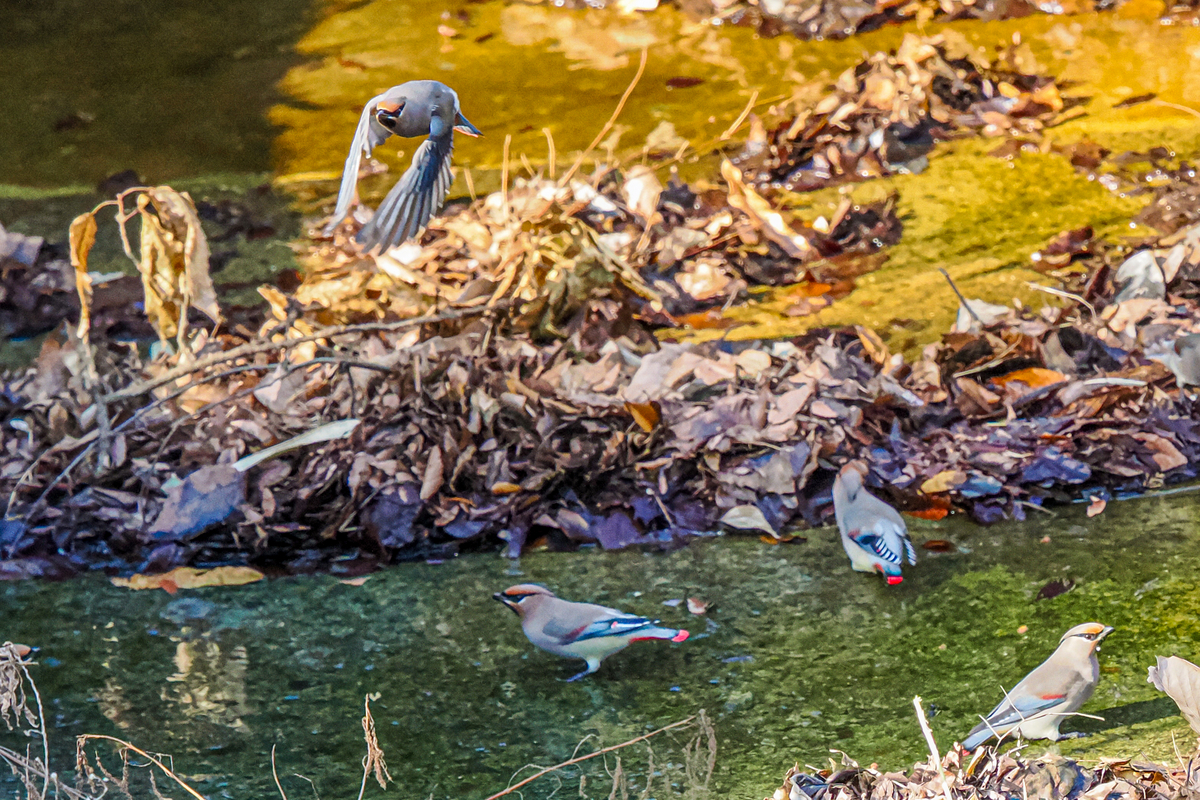 2024-01-08 ヒレンジャクの水飲み いきあたりばっ鳥 ヒレンジャクは餌を食べると水場に降りる。 ヤドリギは粘液が多いから、水が必要かなと思うがエノキの実のような乾いて萎びたものでも、なんでかよく飲む。 急いで消化しなければならない何か訳があるのかしら。