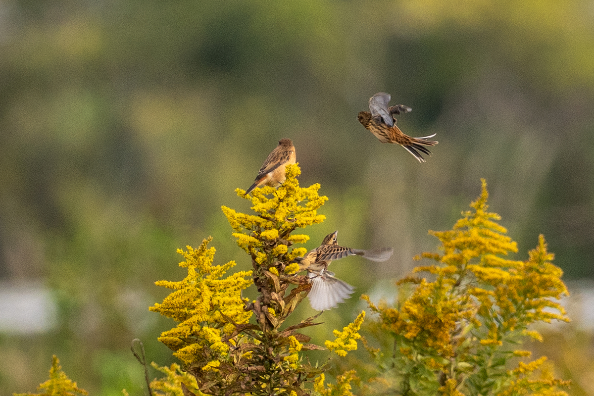 ノビタキに喧嘩を売ってるのかと思ったら、ホオアカどうしのじゃれ合いのようだ。